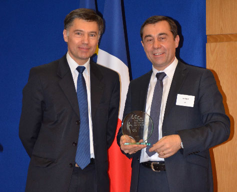 A Bercy, le 17 décembre 2015, remise des Trophées des Territoires Electromobiles 2015. À gauche, Pascal Faure, directeur général des entreprises auprès du Ministre de l’Economie, de l’Industrie et du Numérique, Emmanuel Macron. À droite, Alain Lebœuf, député de la Vendée.